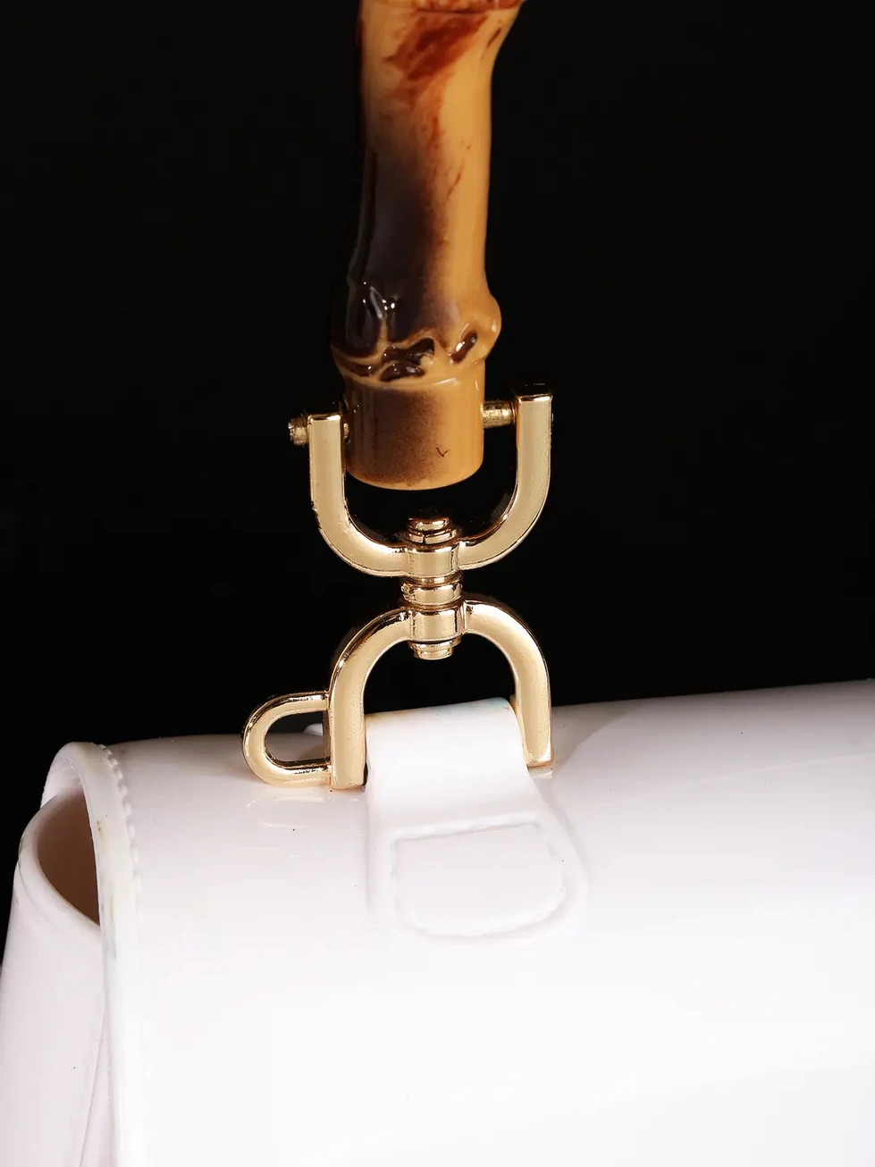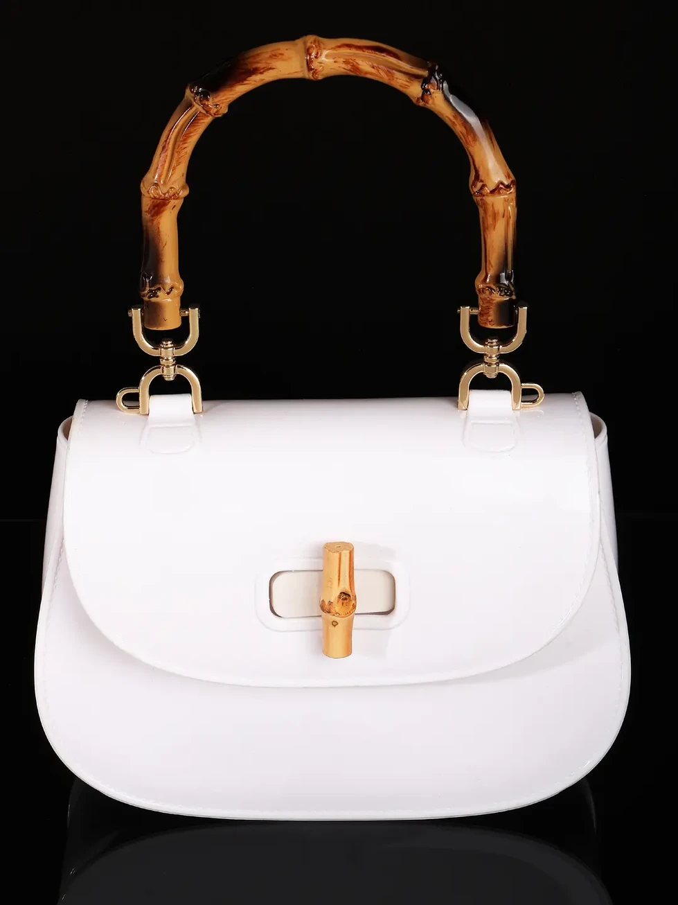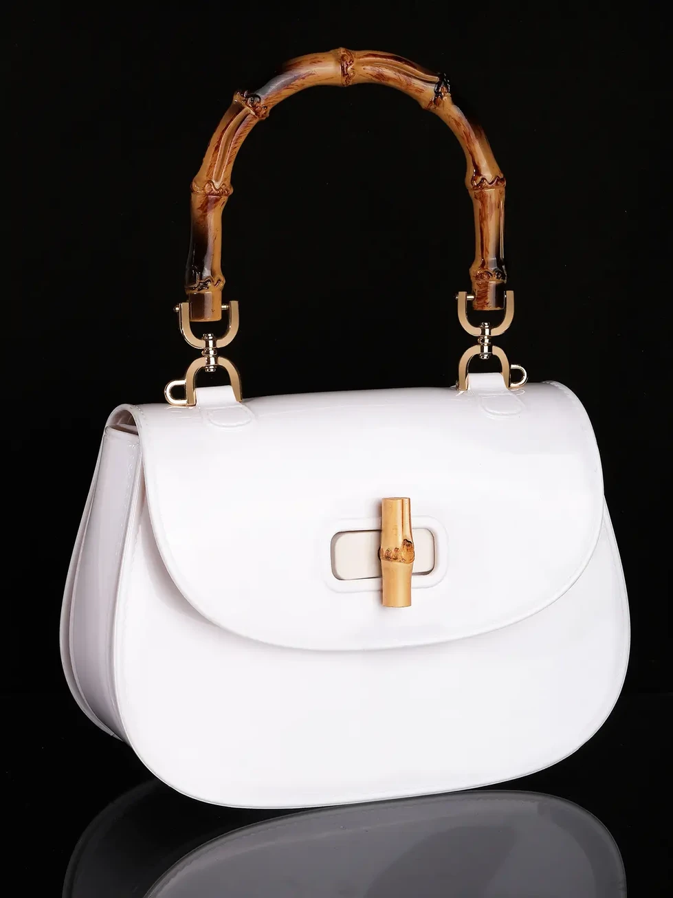 Introducing the Handbag in sleek white, a versatile accessory that effortlessly enhances your casual wardrobe. Measuring 21 x 6 x 28.5 cm and weighing 575g, this glossy handbag features elegant wooden accents, combining modern style with a natural touch.