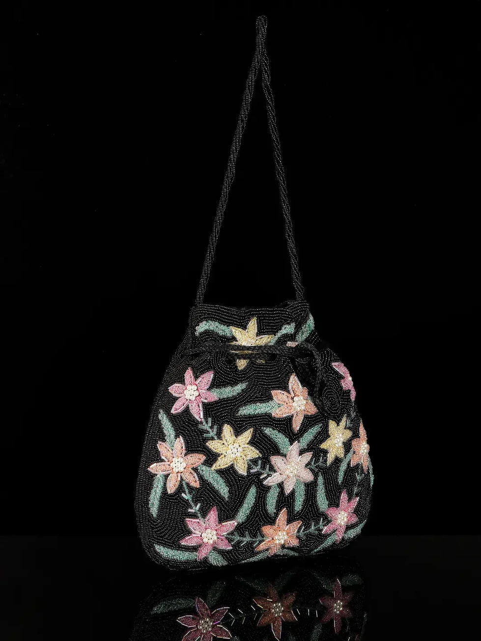 Introducing the stunning Black Beads Front Side Pastel Colour Flower Potli Bag, an accessory that beautifully blends elegance and artistry. With dimensions of 22 x 8 x 35 cm and a lightweight design of just 429g, this fabric bag features intricate stone work and hand-embellished bead details, making it perfect for parties and special occasions.